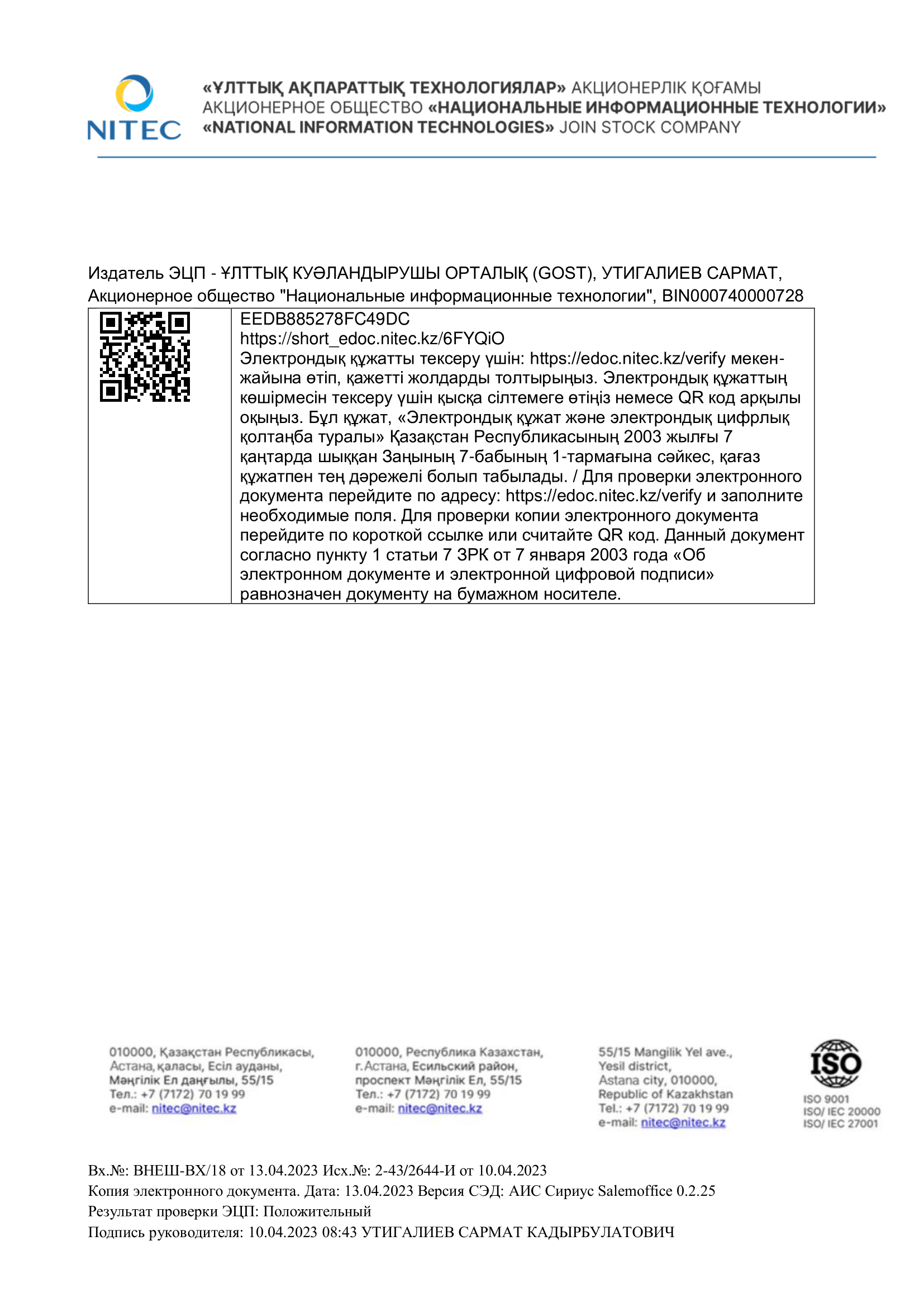 АО «Национальные информационные технологии» Рекомендательное письмо от Ио Заместителя Председателя Правления Утигалиев С.К